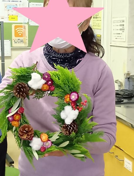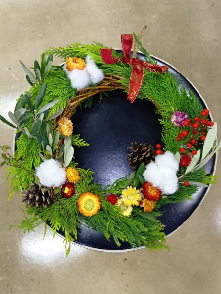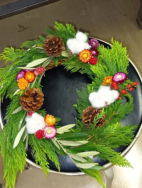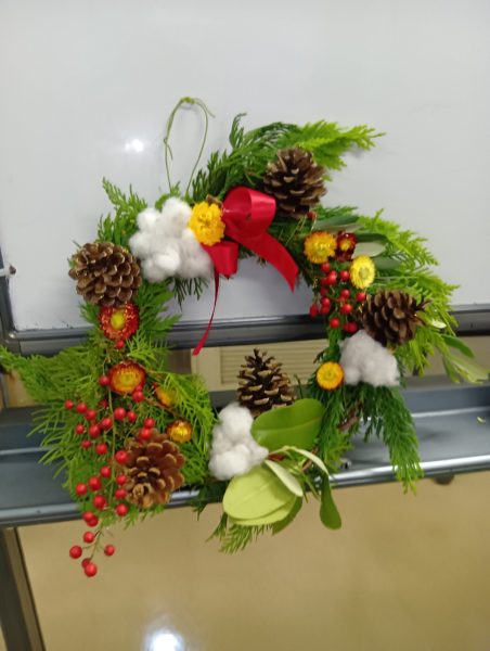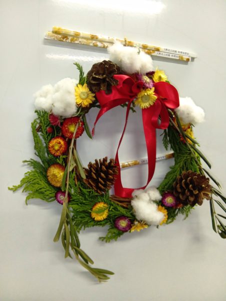 一昨年、昨年とお正月のお飾り作りをしましたが、今年はクリスマスリースを作りました